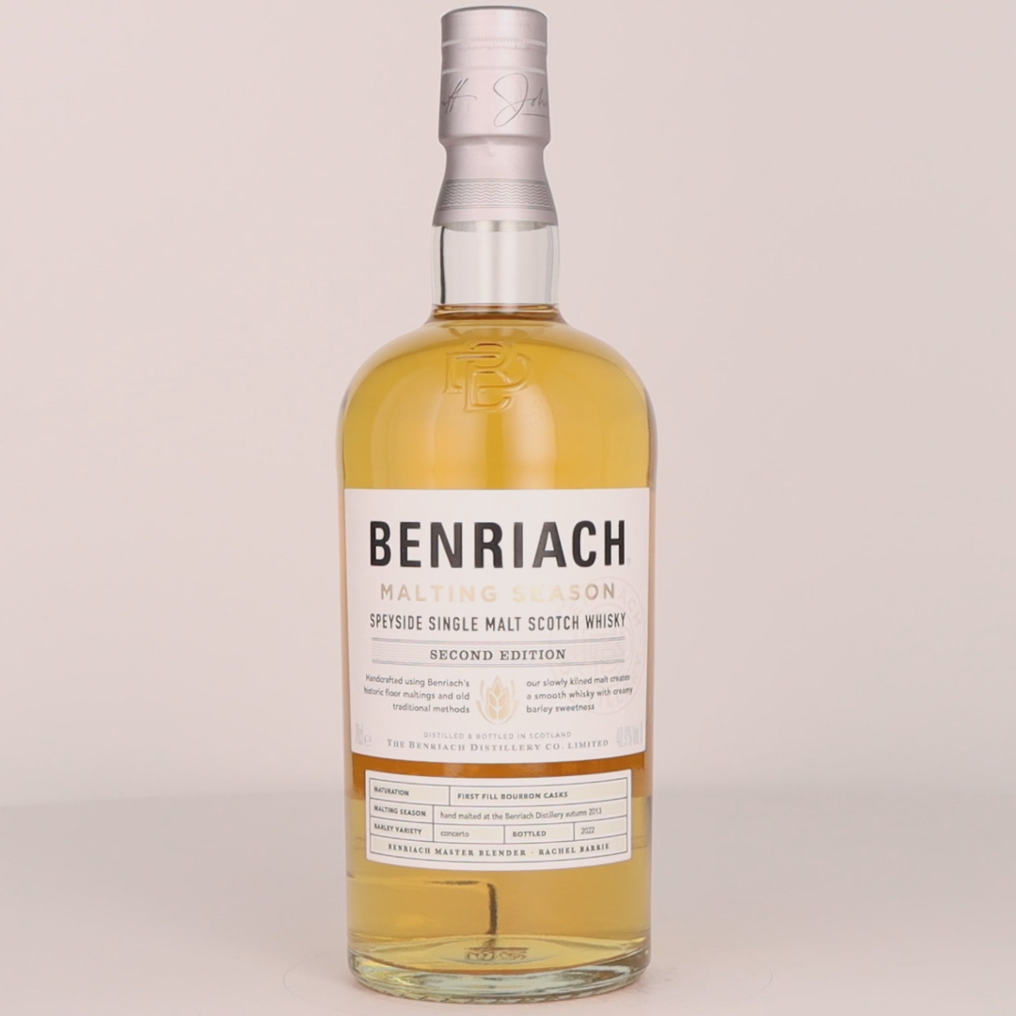 La deuxième édition du “Malting Season” est élaborée à partir de la variété d’orge Concerto, ce qui donne un single malt extraordinairement doux, riche et crémeux. Benriach “Malting Season” célèbre les aires de maltage utilisées depuis plus de 120 ans, et qui constituent le cœur historique de la distillerie construite en 1898 par fondateur intrépide John Duff. Chaque année, pendant la "Malting Season", l'équipe d'artisans dévoués malte manuellement l'orge sur place sur les aires de maltage. Le malt produit donne un whisky vif et crémeux, d'une richesse de caractère exceptionnelle. La deuxième édition du “Malting Season” est élaborée à partir de la variété d’orge Concerto. Une lente maturation dans des fûts de bourbon de premier remplissage produit un single malt extraordinairement doux, riche, crémeux avec des strates aromatiques autour du malt torréfié reflétant la douceur de l'orge écossaise.