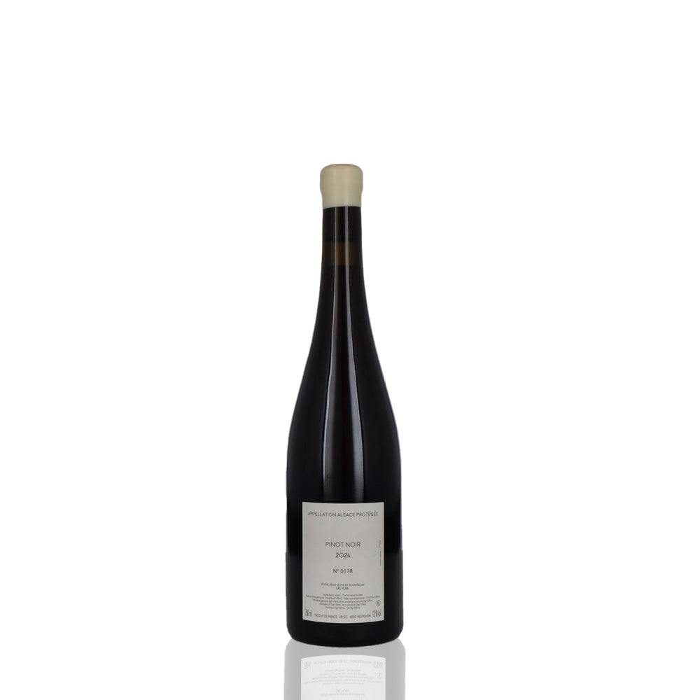 Vin rouge d’Alsace signé Jintaro Yura, 100 % Pinot Noir, issu de vignes sur sols calcaires d’Alsace (Rouffach/Gueberschwihr).