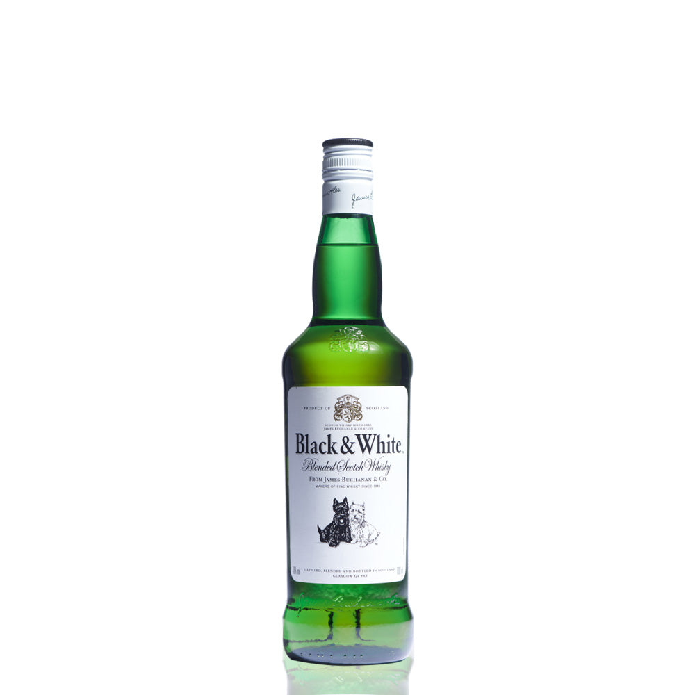 Black & White est un assemblage de 35 whiskies de malt et de grain, réputé pour ses arômes doux et subtils. Cet Old Scotch Whisky est composé entre 60 et 65 % de whiskies de grain et de malts tels que Port Dundas, Cameronbridge et Dalwhinnie. Varitable success story créée par James Buchanan en 1884, Black & White continue d'exister aujourd'hui.