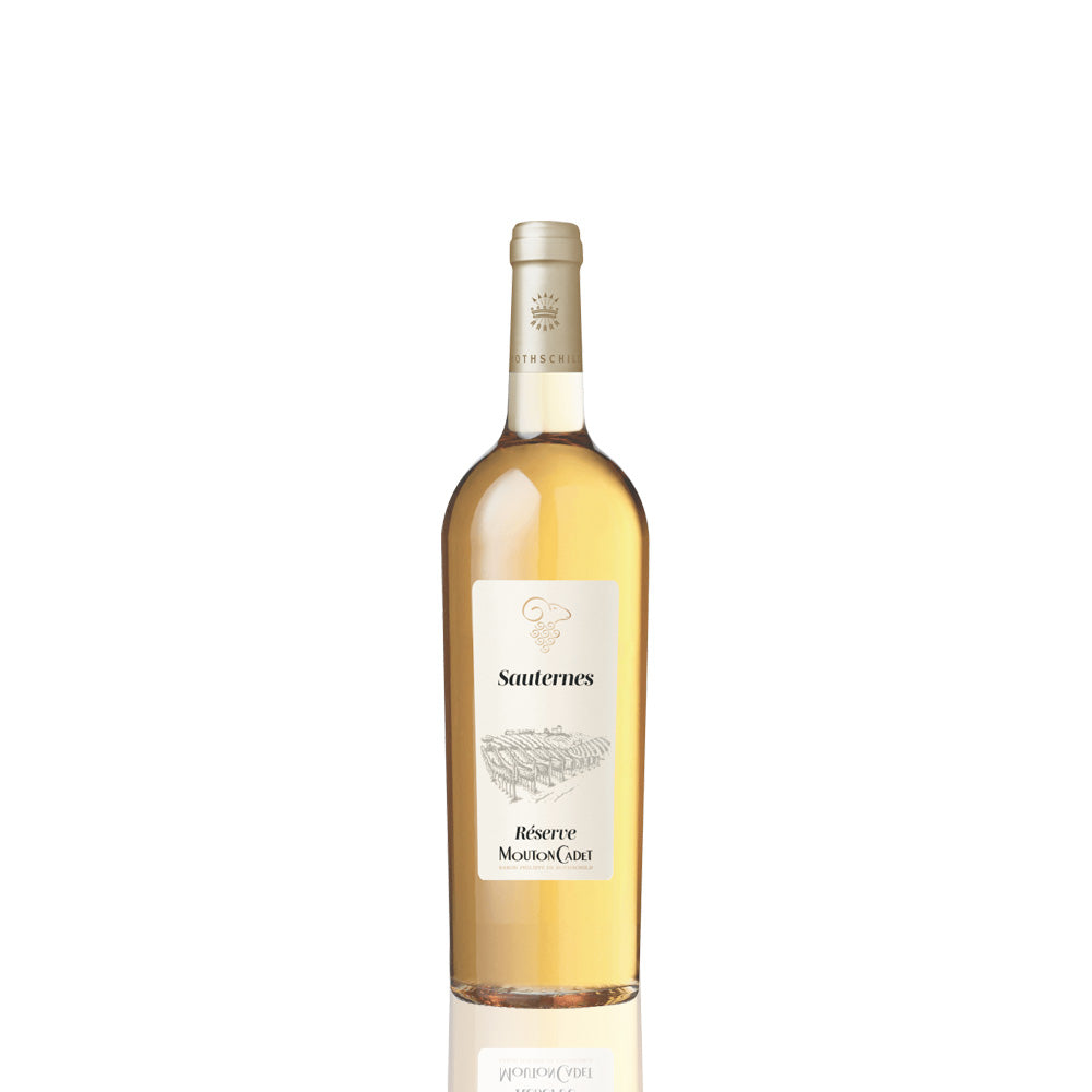 Mouton Cadet Réserve Sauternes (13 %) est un vin blanc liquoreux de l’appellation Sauternes, signé Baron Philippe de Rothschild. Il présente une robe dorée aux reflets ambrés, un nez intense de fruits confits, miel et fleurs blanches, et une bouche riche et veloutée, marquée par une belle fraîcheur et des arômes de pêche, d’abricot et d’épices douces. À déguster bien frais (8–10 °C), idéal avec foie gras, fromages ou desserts.